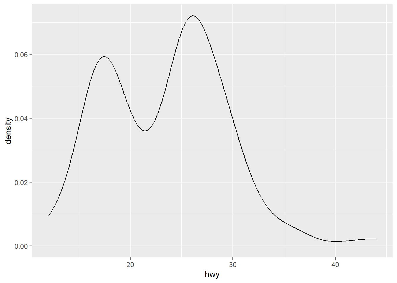 p <- ggplot(mpg, aes(x = hwy)) +