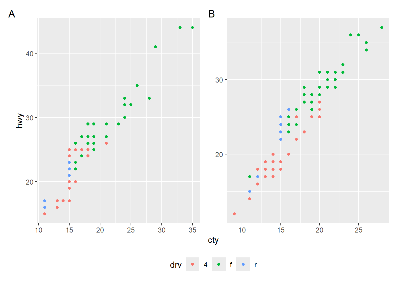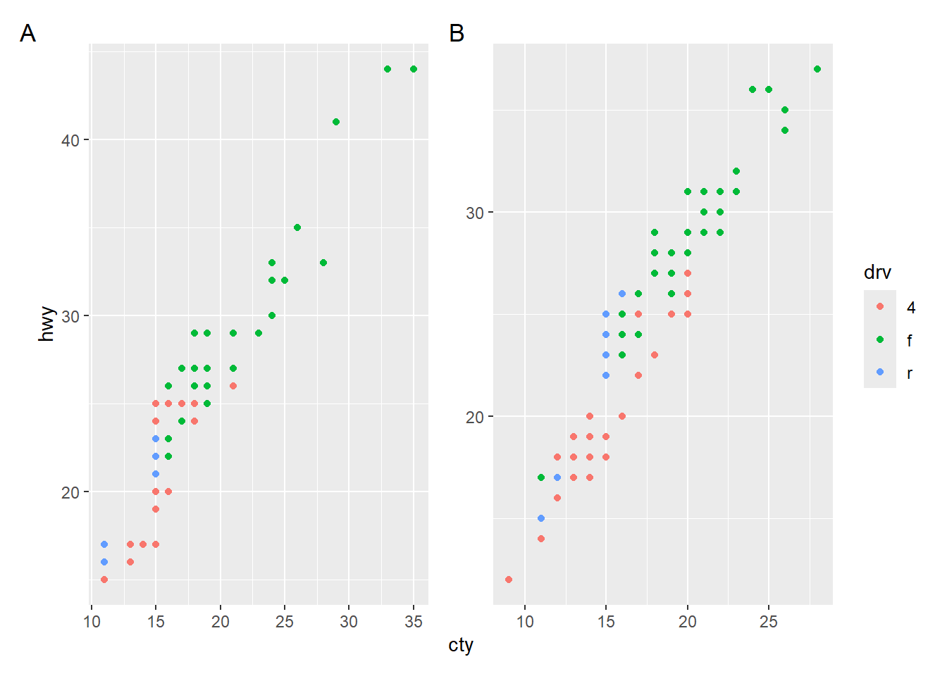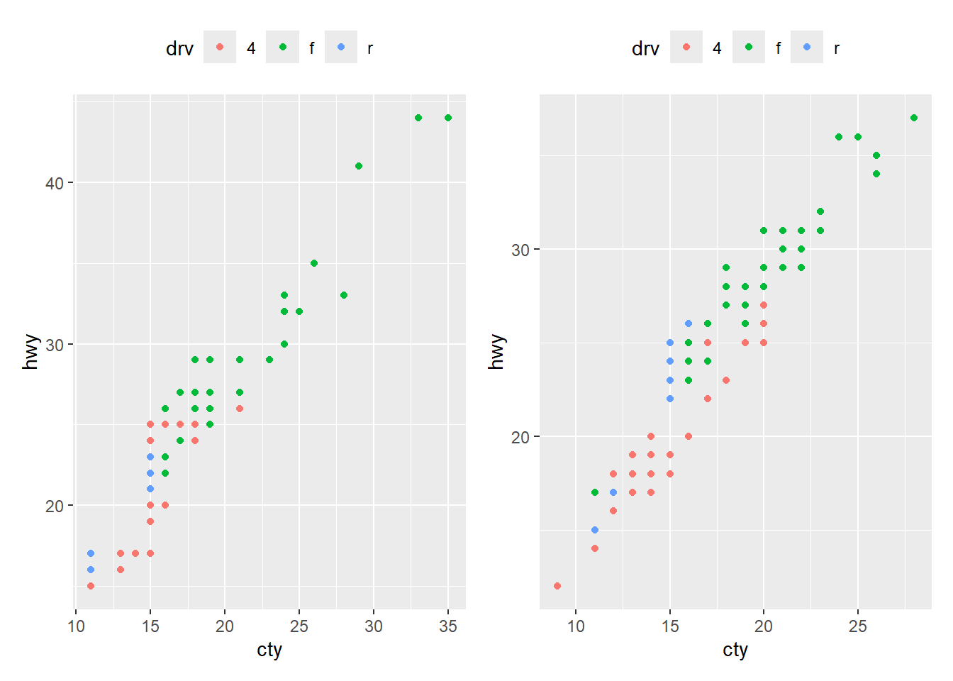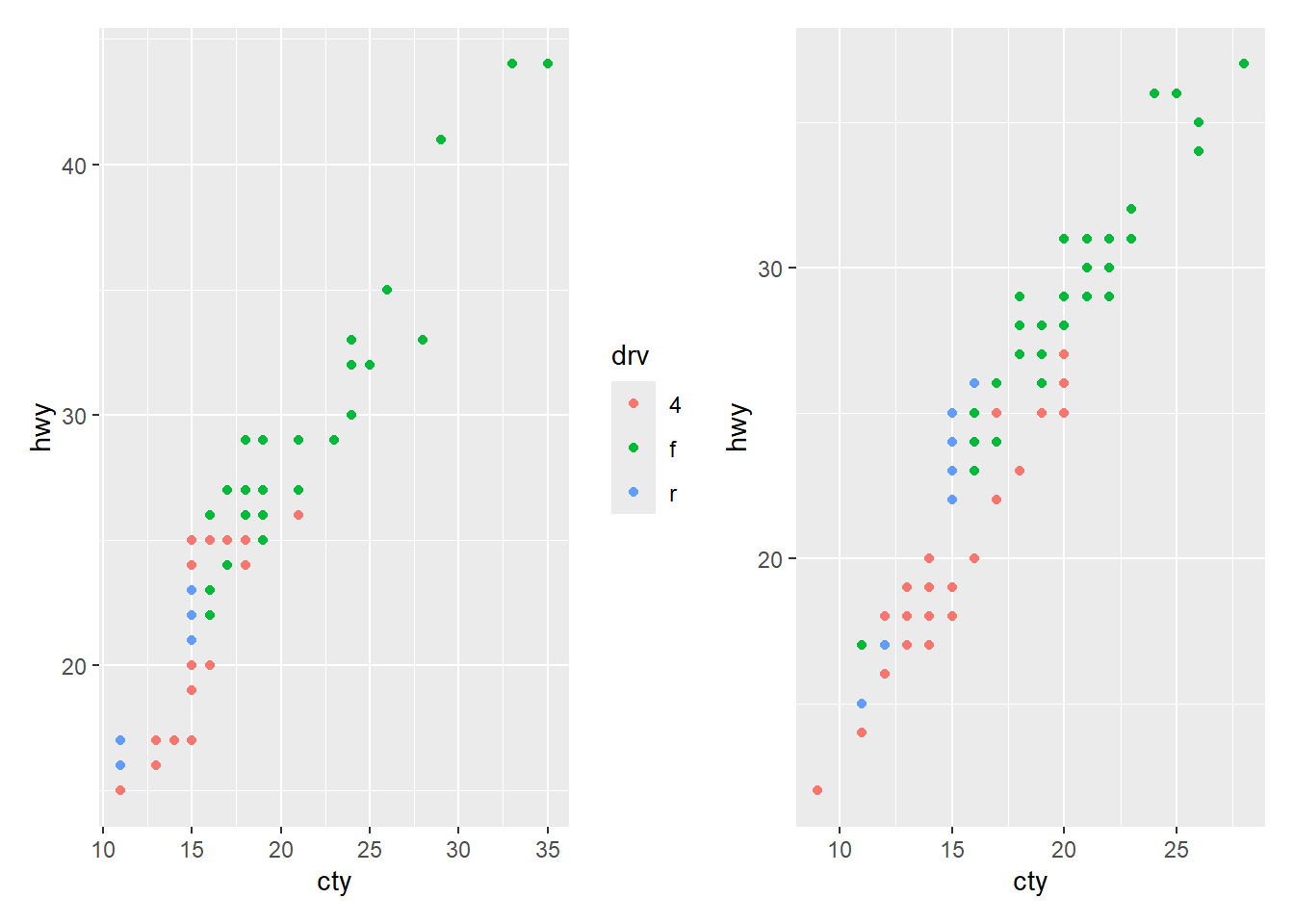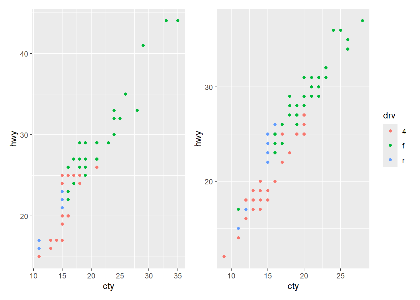 ggplot(aes(x = cty, y = hwy, color = drv)) +