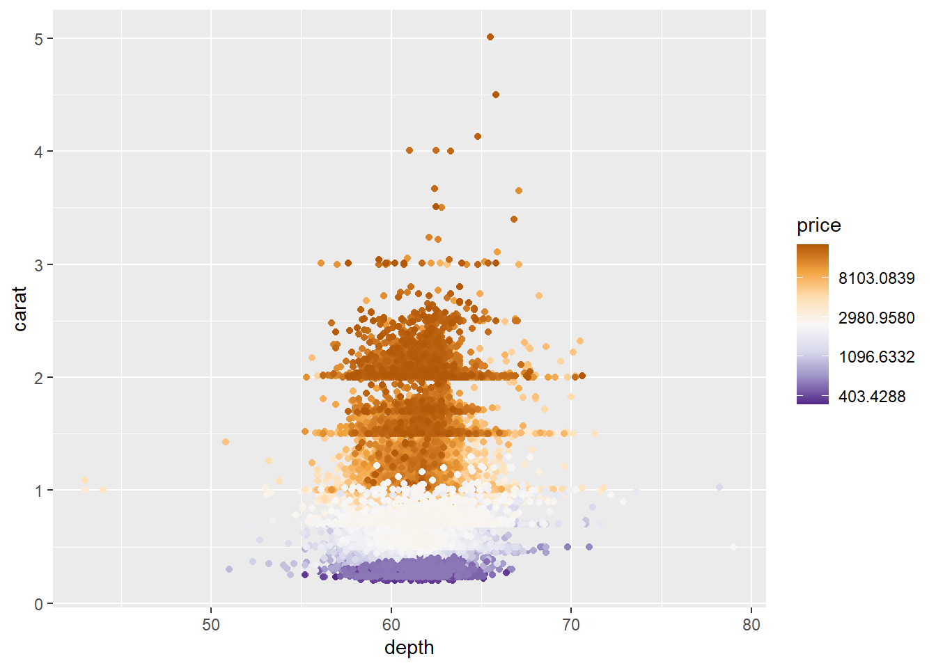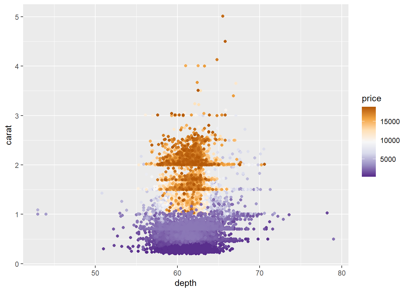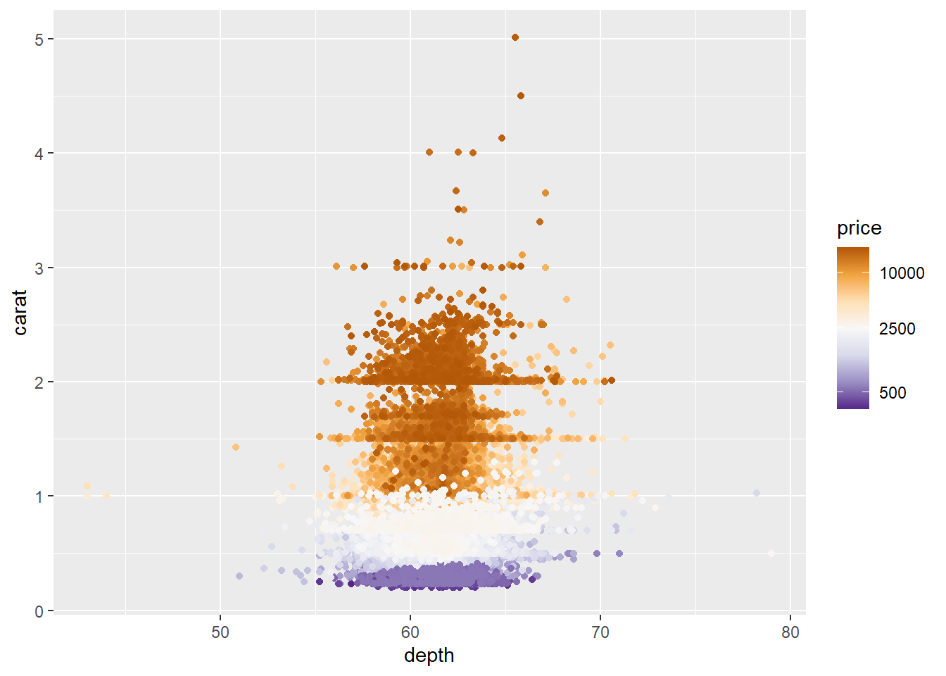 ggplot(diamonds, aes(x = depth, y = carat, color = price)) +